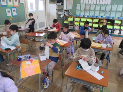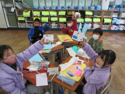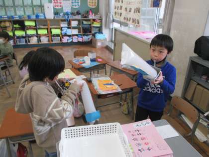 図画工作科では、ストローで息を吹き込み袋を膨らませる作品をつくっています。猫やスポーツカー等、何をどのように飛び出させようか考えながら、楽しく取り組んでいます。