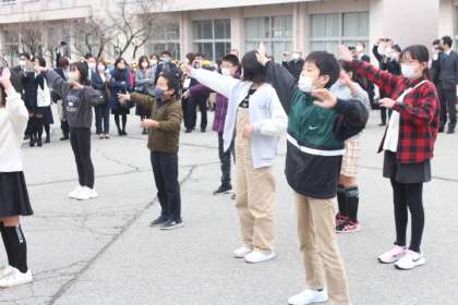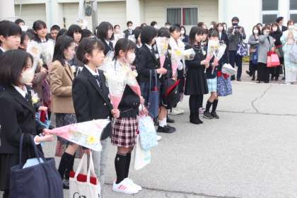 卒業式後、玄関前に全校児童が集まり、巣立ちの会が行われました。