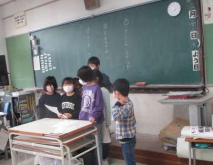 学級集会を開きました。係で考えたクイズをしたり、宝探しをしたりしました。係の人が前に立つと、話を聞く姿勢を整える姿が見られ、1年間の成長を感じました。