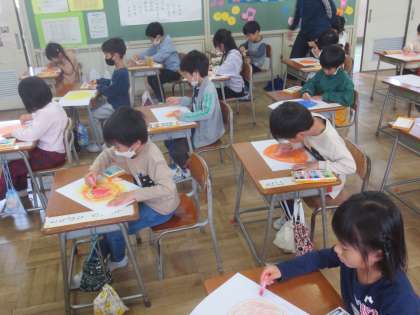 図画工作科では、「にこにこのおひさま」を描きました。それぞれにこだわりをもっておひさまを仕上げました。それから、練習をしてきた自分の名前をきれいに清書しました。学習参観で家の方に見ていただくのを楽しみにしています。