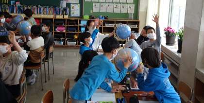 写真は1組の様子です。地球儀、世界地図を使って理解を深めています。