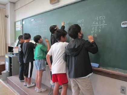 位に気を付けながら、大きな数を読んだり書いたりしています。かける数が3桁のかけ算の筆算に挑戦しました。