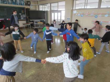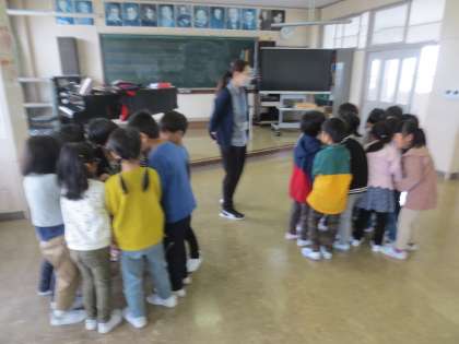 音楽科の学習で、4階にある音楽室へ行きました。「さんぽ」に合わせて踊ったり、「ひらいたひらいた」の歌に合わせて、みんなで輪になってひらいたりつぼんだりしました。