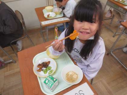 毎日楽しみにしている給食では、調理員さんが食材をいろいろな型抜きで抜いてくださっています。その材料で調理してくださっているので、ラッキー人参やラッキー大根と言って、見付けた子供たちは大喜びです。「うさぎ」「小鳥」「ハート」「星」「ダイヤ」等、様々な形の人参や大根、こんにゃくがあります。