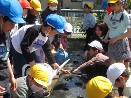 サツマイモの苗を、先週準備した畑に植えました。一人1本ずつ植えました。これからは、2年生で交代で水やりをしながら育てていきます。