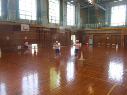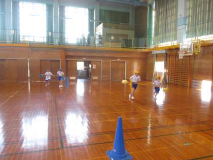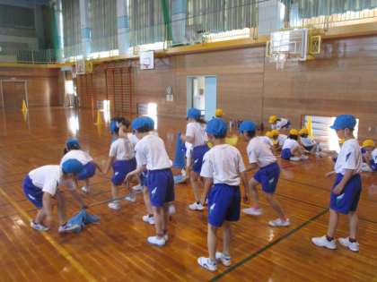 3年生は、中学年の団体種目「台風の目」に初めて挑戦します。バーを持ってコーンを回ったり、バーを飛び越えたりと、競技中の動きの多さに悪戦苦闘しながらも、声をかけ合いながら一生懸命頑張っています。