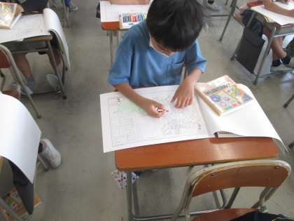 白地図に色を塗ると、富山市の南側には森や畑が、中心地から北側にかけて住宅街や鉄道等が集中していることに気付くことができました。