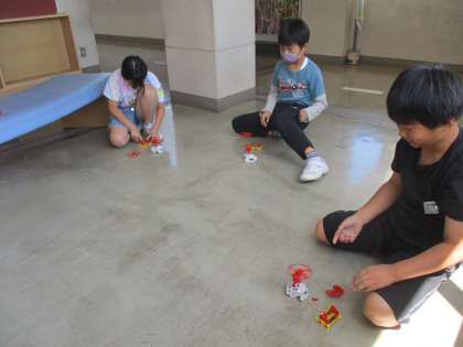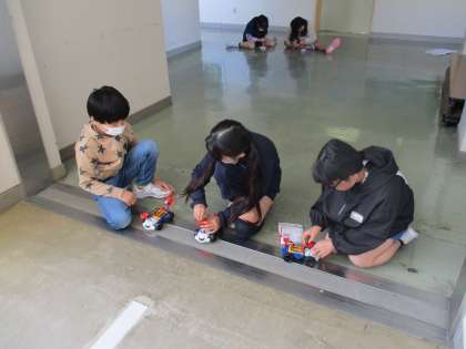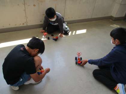 直列つなぎと並列つなぎを学習しました。つなぎかたによって電流の大きさが変わるのかを、モーターに付けたプロペラを飛ばしたり、車を走らせたりして調べました。