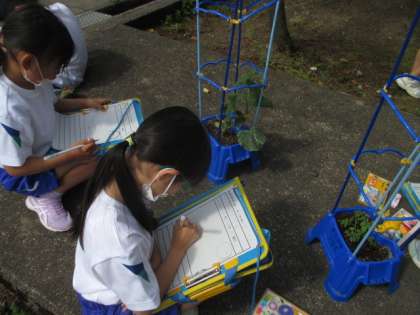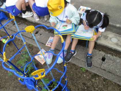 子供たちが記入している観察カードには、「おいしい野菜に育ってほしいです」「早く食べたいな」など、収穫を待ち望んでいる様子が見られます。