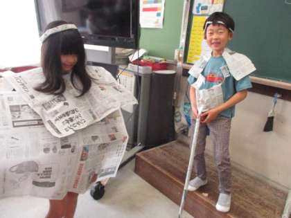 新聞紙を触りながら形を変え、思いついたものを創作しました。