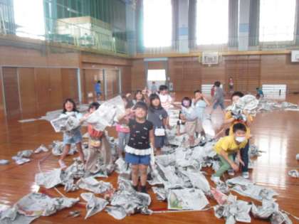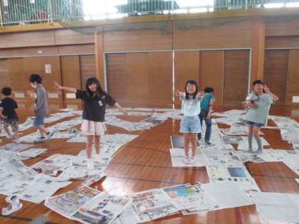 今日は、2年生全員で「新聞となかよし」の学習を体育館で行いました。広い場所を生かして、サッカーゴールを作ったサッカーゲームや、新聞温泉、新聞迷路等、思い思いのものをつくりました。
