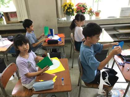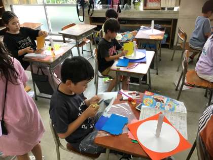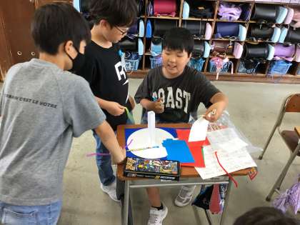 回転する仕掛けを丁寧に作り、楽しい作品にしようと工夫を凝らす子供たちの様子が見られます。