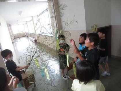熊野校区の方に立派な笹竹をいただいたので、さっそくお願い事を書きました。短冊には、「陸上の記録を更新できますように」「お金持ちになれますように」など、いろいろな願い事が書かれていました。叶うといいですね!