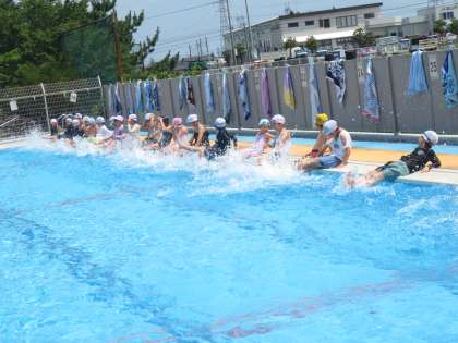 十分水に慣れたところで、目当て別に3グループに分かれて学習しました。長い距離を美しく泳ぎたい「いるかグループ」。もっと上手に泳ぎたい「とびうおグループ」。水に慣れて泳げるようになりたい「めだかグループ」。同じ目当ての友達と一緒に取り組み、充実した水泳学習になりました。