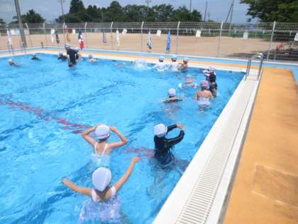 水泳学習も3回目。準備運動、水に慣れる遊び、流れるプール作り。