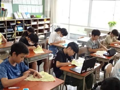 家庭科では、裁縫に取り組んでいます。波縫い、返し縫い、玉留め、玉結び、集中してがんばっています。