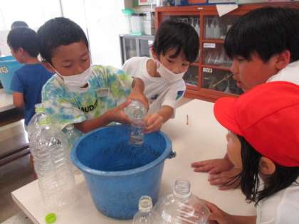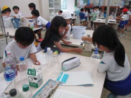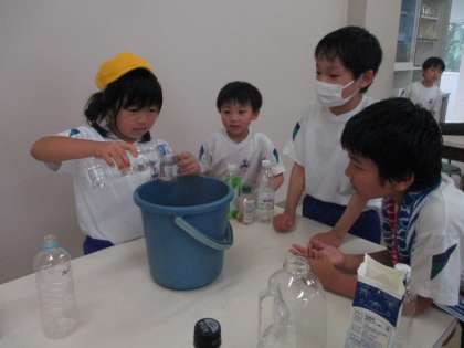 1デシリットルのますで、いろいろな入れ物に入る水のかさを調べました。予想を立て、水のかさがぴったりだったときは、嬉しそうでした。