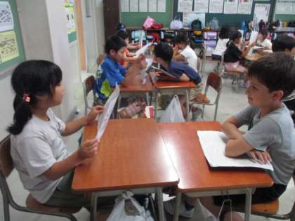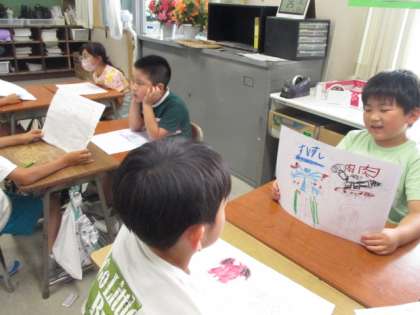 国語科の学習で、「あったらいいな」と思うものについて、1組と2組で交流をして発表会をしました。