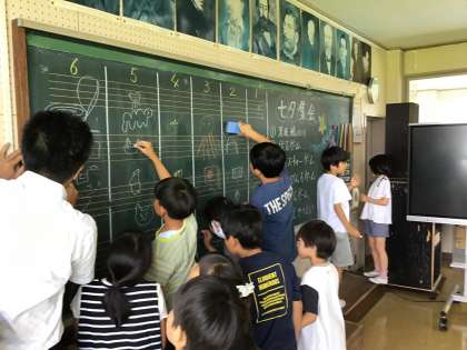 織り姫と彦星の七夕物語をテレビで視聴した後、みんなで絵しりとりやジェスチャーゲーム等で楽しい時間を過ごしました。