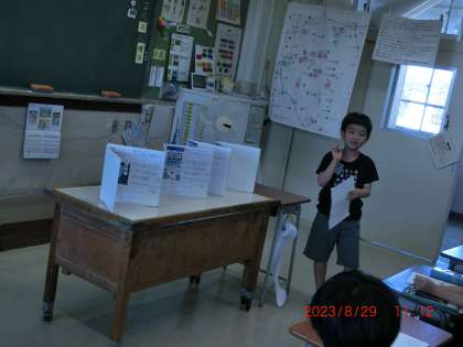 3年生の廊下には、工夫を凝らした自由研究が並んでいます。休み時間になると、興味津々で眺めたり、触れたりしています。友達の工夫を学び、来年の自由研究に生かせるといいですね。