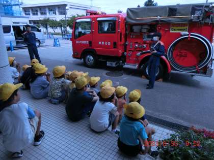 今日は、消防署と消防団の方が合わせて4名学校に来られ、消防車の設備を詳しく説明してくださいました。子供たちは、いろいろな角度から消防車の写真を撮ったり、疑問に思ったことを質問したりしました。