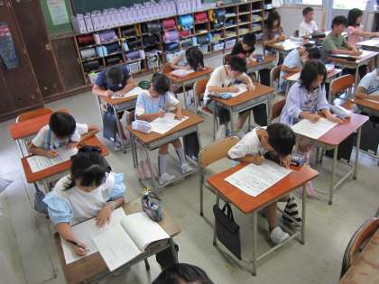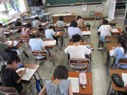 「わたしと小鳥とすずと」「夕日がせなかをおしてくる」の2つの詩のそれぞれを連ごとに比べ、相違点を話し合いました。その後、好きな詩を選んで朗読し、丁寧に視写し、イメージに合う色を塗ったり絵を描いたりしました。9月27日の学習参観に掲示する予定です。