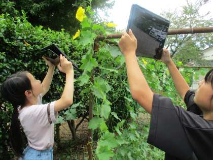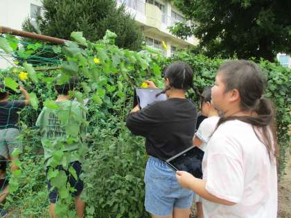 ヘチマを観察しました。葉の数が増えたり、花が咲いて実ができ始めたりするなど、夏休み前よりもぐんぐん成長している様子を見て、驚いていました。