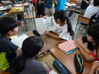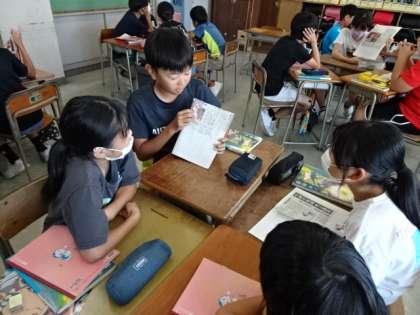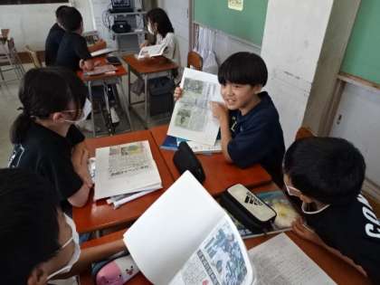 写真は1組の様子です。友達と記事を紹介し合うことで、社会で起きていることへの興味も広がります。