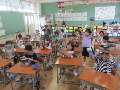 生活科の学習で、虫探しをした後、少しの間飼育しました。どんなすみかにすればいいかな?何を食べるのかな?など、いろいろ調べて虫を観察しました。捕まえるのがちょっと怖かった子供も、棲みやすい家になるように工夫しました。