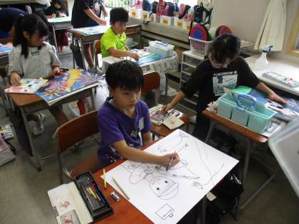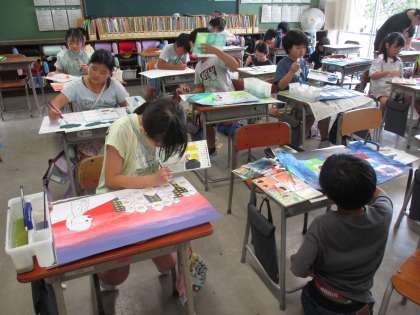 宿泊学習やクラブ活動、夏休みに行った旅行など、思い出に残っていることを絵に表しています。色の使い方や、塗り方を工夫しながら描いています。