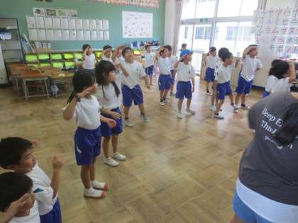 今週から、新しいダンスに挑戦しています。初めてなので、映像を見ながら一生懸命にまねをして踊りました。6年生が教えに来てくれて、みんなで楽しく踊りました。
