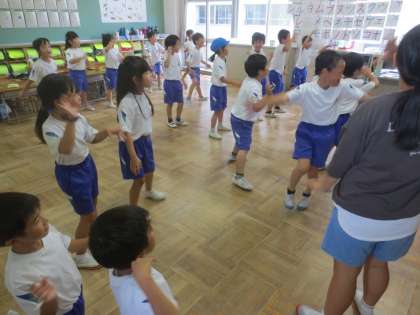 今週から、新しいダンスに挑戦しています。初めてなので、映像を見ながら一生懸命にまねをして踊りました。6年生が教えに来てくれて、みんなで楽しく踊りました。