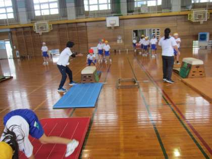 富山市スポーツ協会等から3名の先生方が来られ、跳び箱の指導をしてくださいました。開脚跳びに必要な踏切の仕方、手を着いて体を支えながらおしりをあげること、ぴたっと止まる着地等、スモールステップで教えていただきました。終わる頃には「え、もう終わり?」の声が聞かれ、充実した時間だったことがうかがわれました。