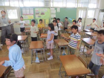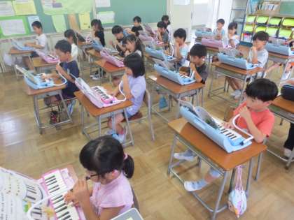 音楽科の学習で、鍵盤ハーモニカを練習しています。正しい指使いできれいな音を出そうと頑張っています。また、今日は、ドラえもんの歌に合わせてリズムダンスを踊りました。