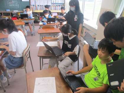 アンケートを集計し、発表内容を考えています。(6年生)