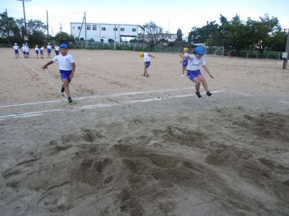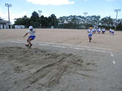 体育科では、走り幅跳びを練習しています。歩幅に合わせて助走の距離を決めたり、跳ぶときの姿勢を映像で確認したりして、記録を伸ばそうとがんばっています。