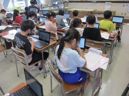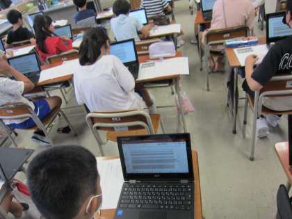 クロムブックを使うと「〇〇さんの文、おもしろいなあ」「同じ写真でも、いろんな文で説明できるんだね」と、全員の考えを見ることができます。ローマ字の練習になるため、一石二鳥です。