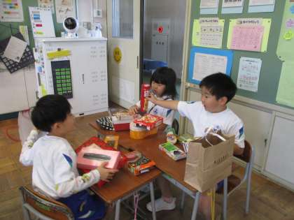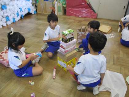 算数科の学習で「かたちあそび」をしています。いろいろな形の箱を積み上げたり、並べたりしてみました。どのような形を作ろうかを考えながら、組み立てました。