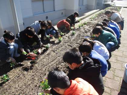 花壇にパンジーとビオラ、チューリップの球根を植えました。きれいな配置になるように考えながら、協力して植えました。