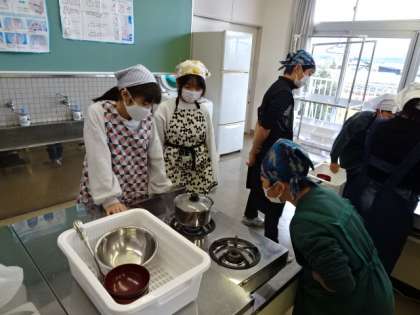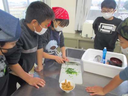 家庭科では、食物の栄養について学習し、実際にみそ汁を作りました。水やみその量、包丁の使い方等に気を付けてみんなでおいしくいただきました