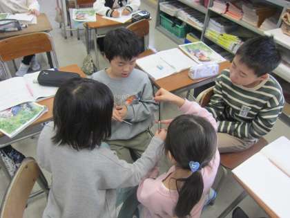 理科の学習で、トライアングルの音が出るときどうなっているのか観察しました。トライアングルに付箋をつけて様子を見たり、軽く触れたり、ぎゅっと握ったり。グループで協力し実験しながら、「洗濯機みたいに震えている」「強くたたくと震え方が大きくなる」「ぎゅっと握ると、音が止まったよ」と、感じたことを話し合っていました。