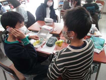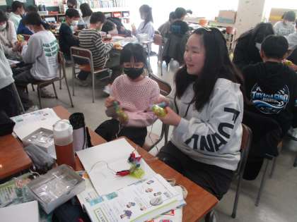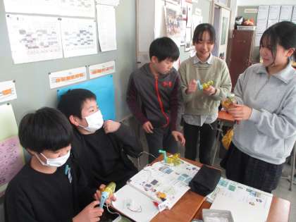 理科では、電気の学習をしています。小型発電機を使って電子機類を動かしました。