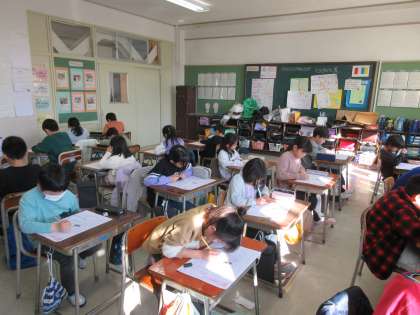 12月になり、2学期に学習したことが身に付いているかどうか、たしかめのテストを行っています。授業では、友達と活発に話し合いながら学んでいますが、今日は自分の力を出し切るため、集中して時間いっぱい取り組んでいました。