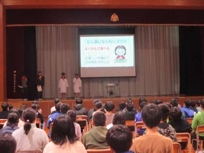 保健委員の発表では、歯科検診の結果について取り上げ、むし歯がどのようにしてできるのか、むし歯にならないためにどのような事に気を付けたらよいかについてみんなで学びました。