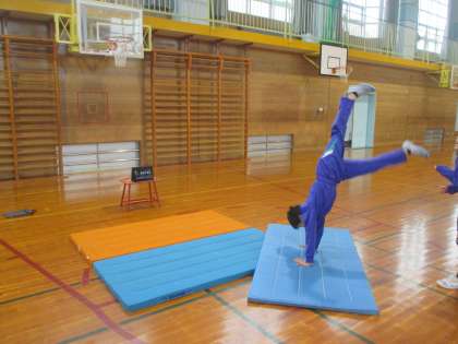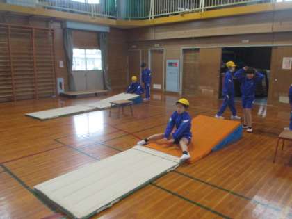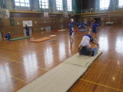 体育科では、マット運動を行っています。とび前転や倒立前転等、前転を応用した技を練習しました。クロムブックを使って、身体の動きを確認したり、友達同士でアドバイスをしたりして取り組んでいます。写真は2組の様子です。