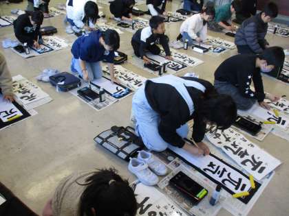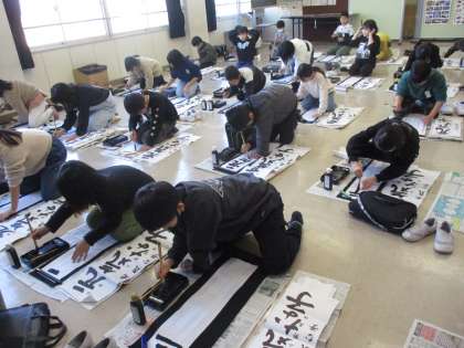 書初大会では、練習の成果を出し切ろうと、真剣に取り組みました。