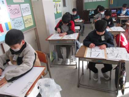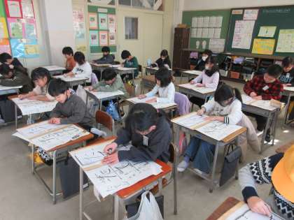 始業式後の書き初め大会は、真剣に一文字ずつ書く姿が見られました。達成感のある表情から、冬休み中の家でのがんばりも伝わってきました。