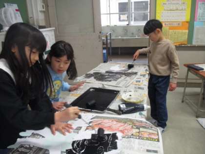 2学期から作成を進めていた紙版画。3学期に入り、刷り作業を行いました。