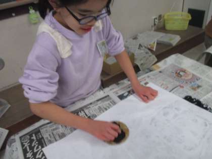ローラーでインクを塗り、ばれんでこすると、絵がうつります。子供たちは、少しずつ絵が浮かび上がる様子を楽しんでいました。