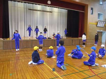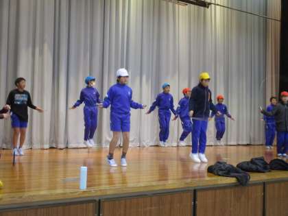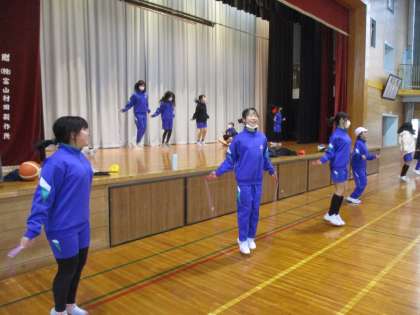 体育科での短縄跳びの様子です。自分の得意な跳び方で回数対決しました。